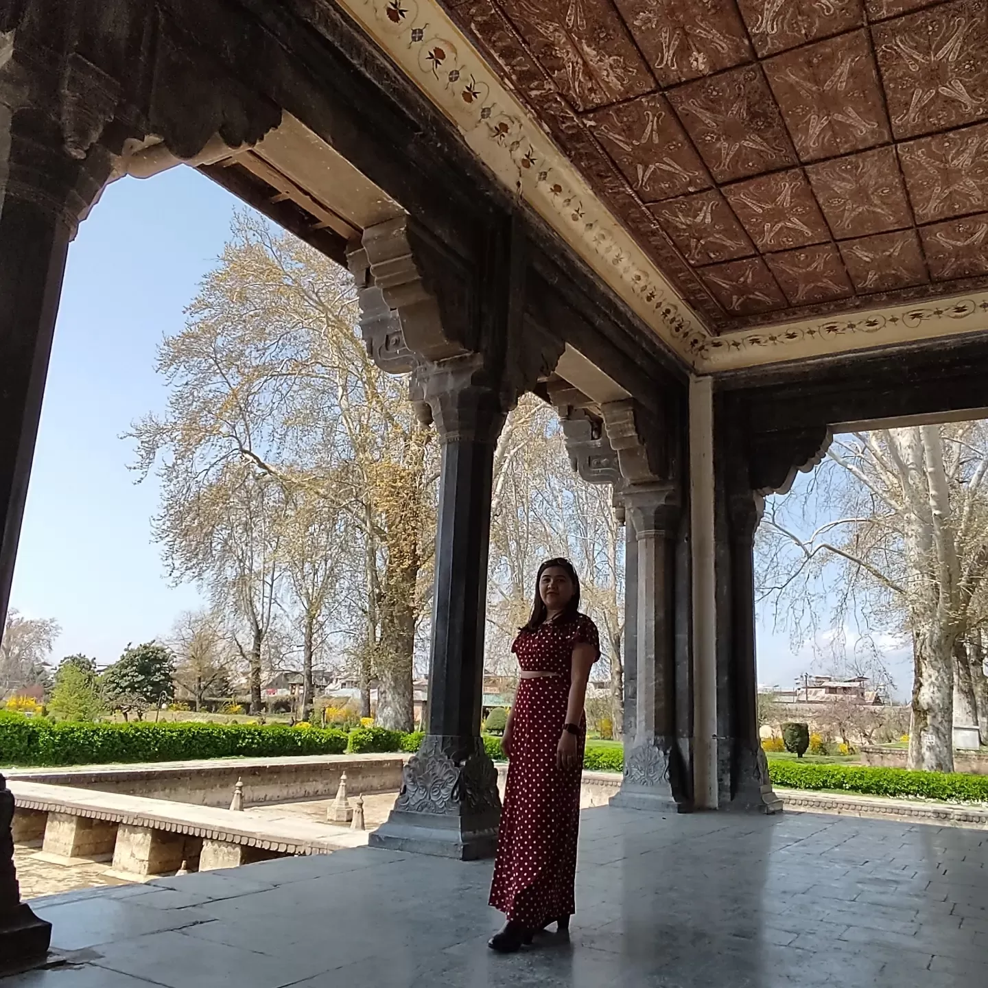 Frescoes: The frescoes are the paintings that adorn the walls and ceilings of the pavilions and the baradari. They depict various scenes and themes, such as floral motifs, geometric patterns, hunting scenes, court scenes, and mythological stories. The frescoes also use various colors and styles, such as blue, green, red, gold, and Persian, Mughal, and Kashmiri.