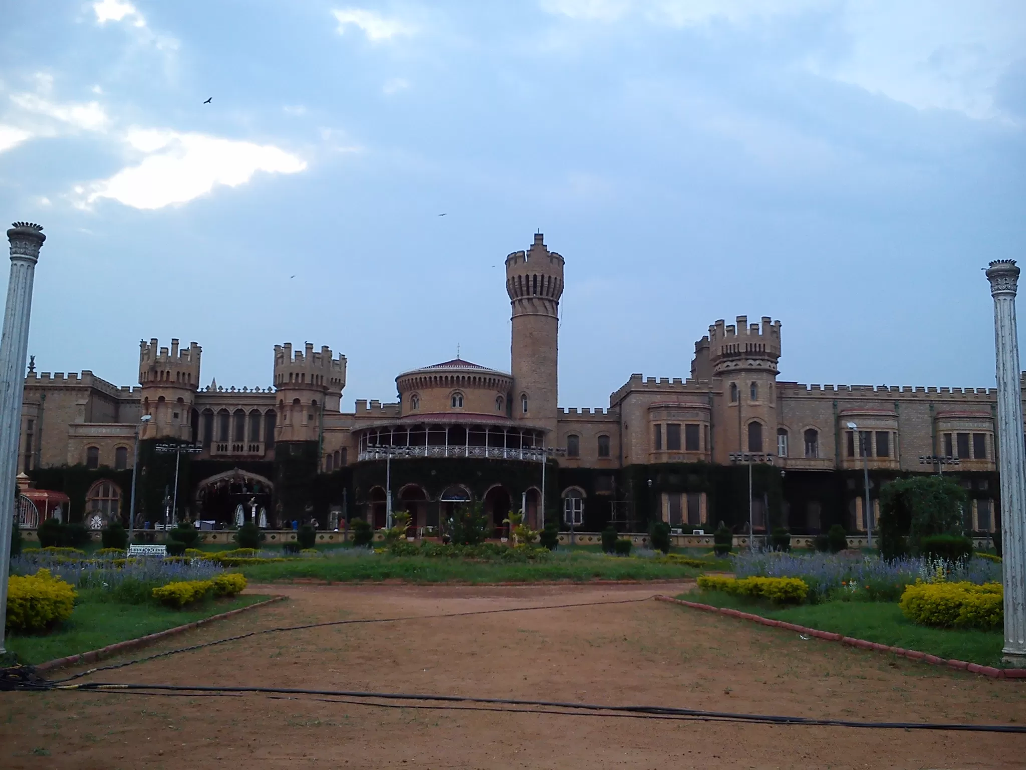 Bangalore Palace is a rectangular structure that covers an area of 45,000 square feet. It has two floors and a basement. The facade is painted in yellow and white, with red accents. The palace has four towers at each corner, with turrets and battlements. The walls are fortified with granite stones and flanked by lush green lawns.