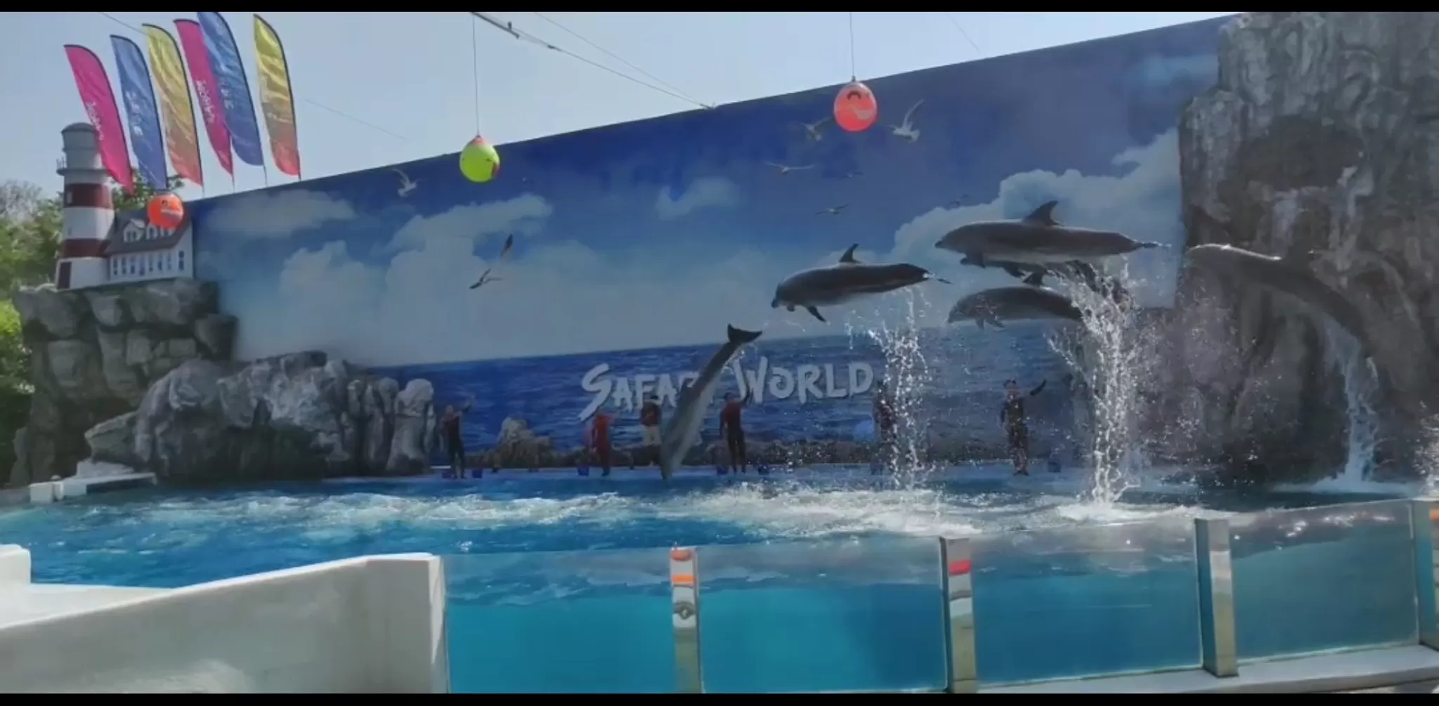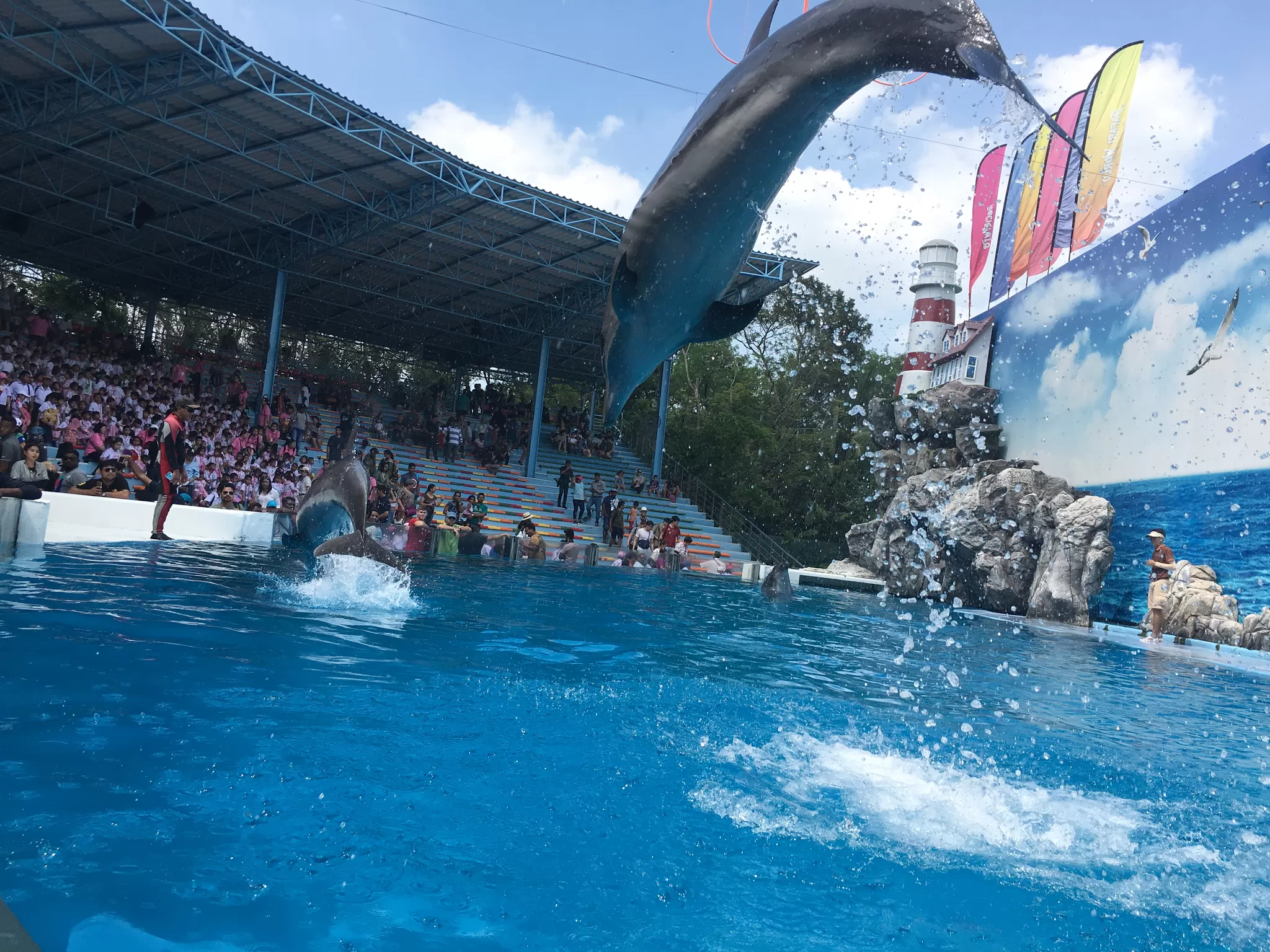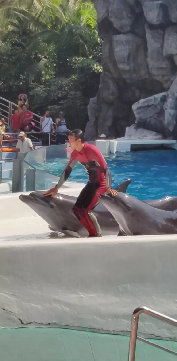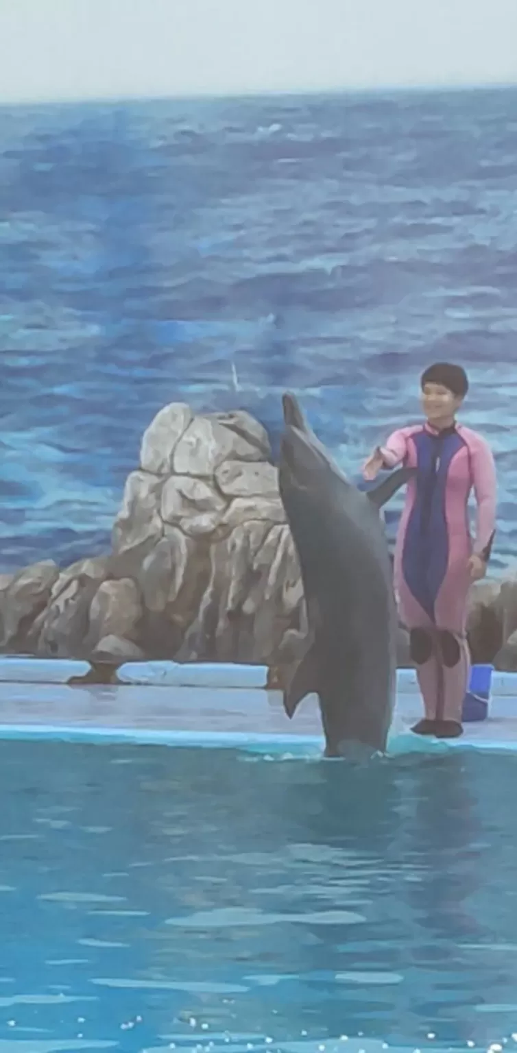 Dolphin Show: This is the most popular show in Marine Park, where you can see the dolphins perform amazing tricks and stunts, such as jumping, spinning, flipping, and dancing. You can also see the dolphins interact with the trainers and the audience, and even join them in the water for a swim or a kiss.