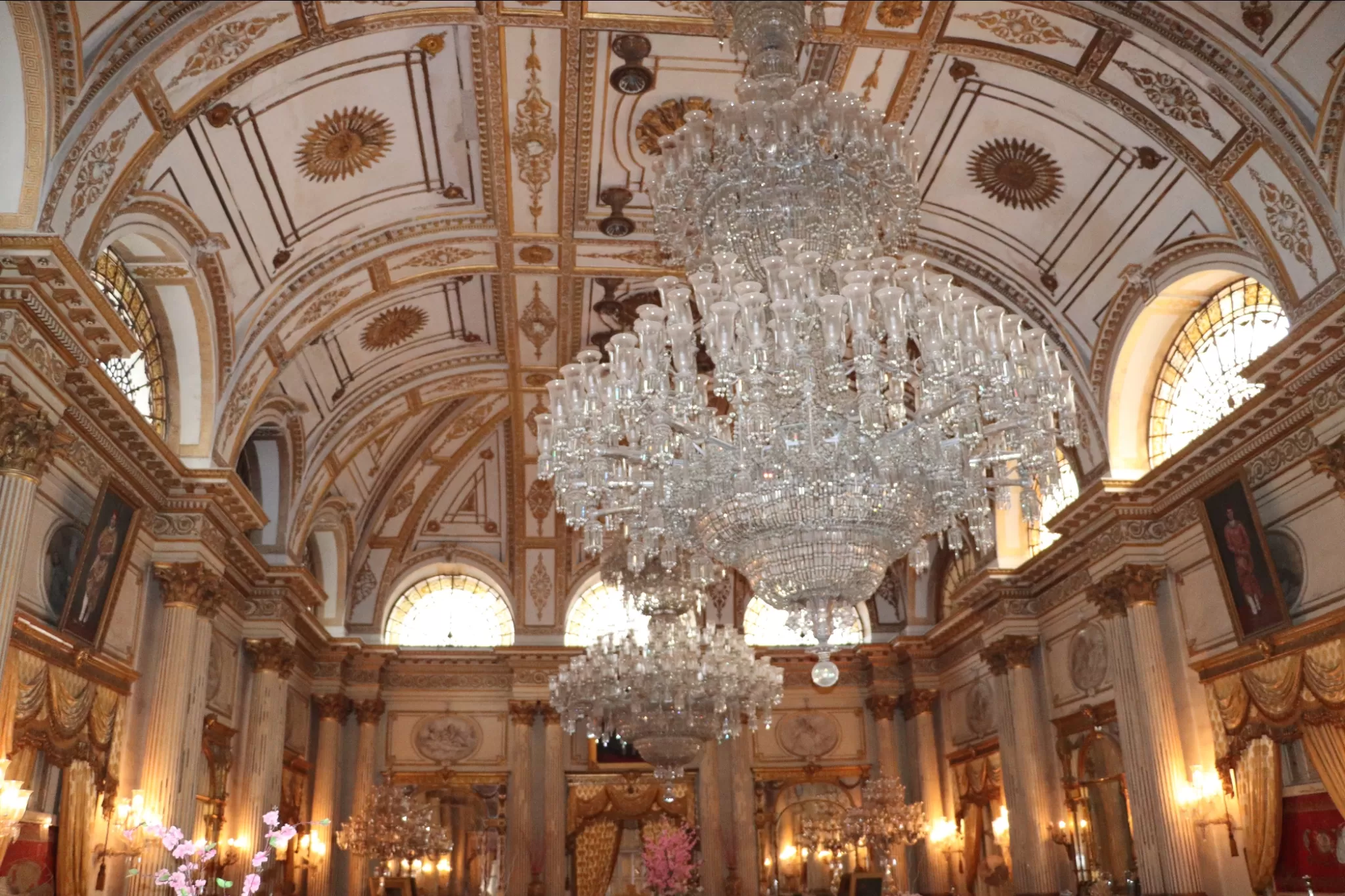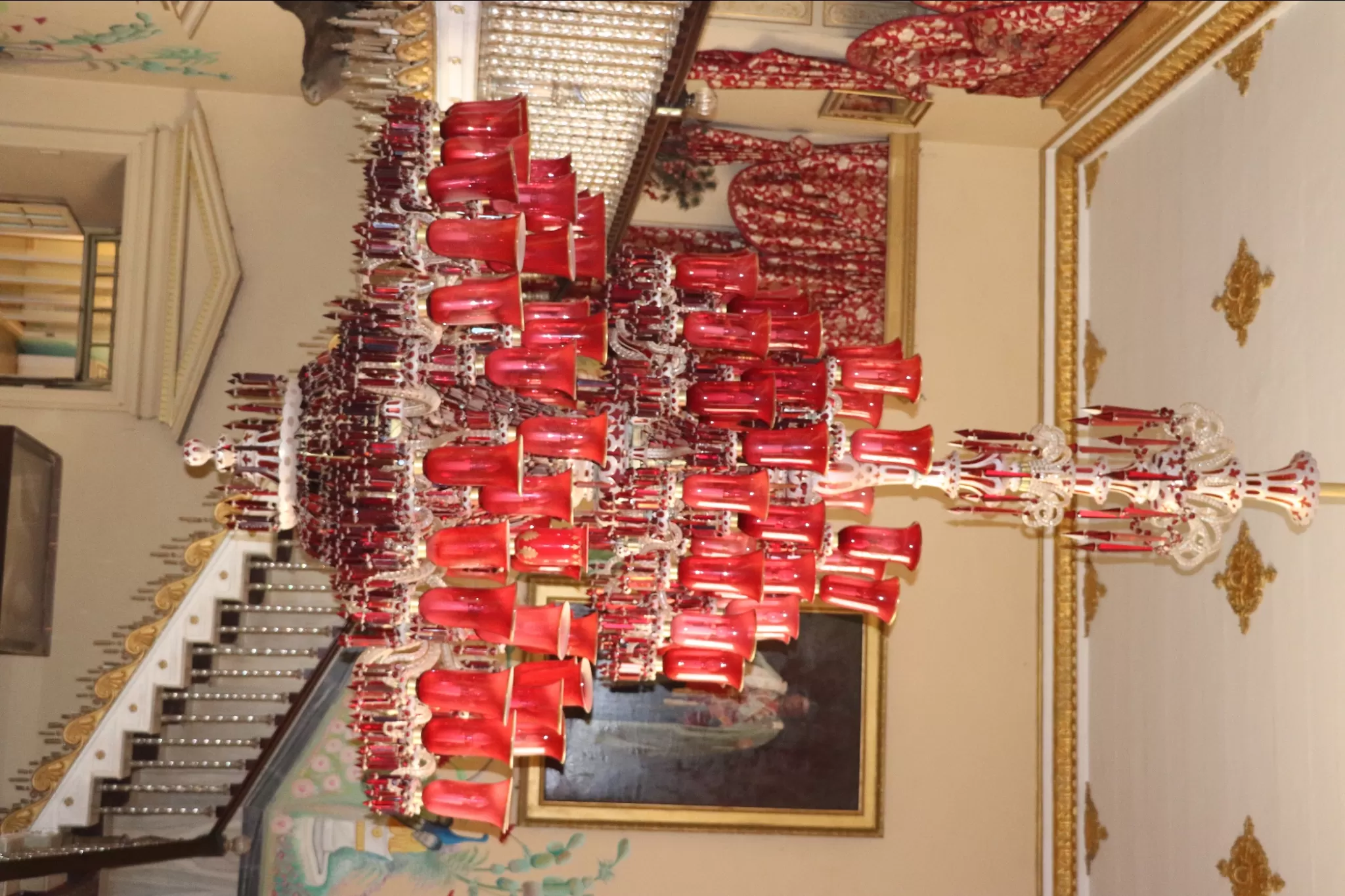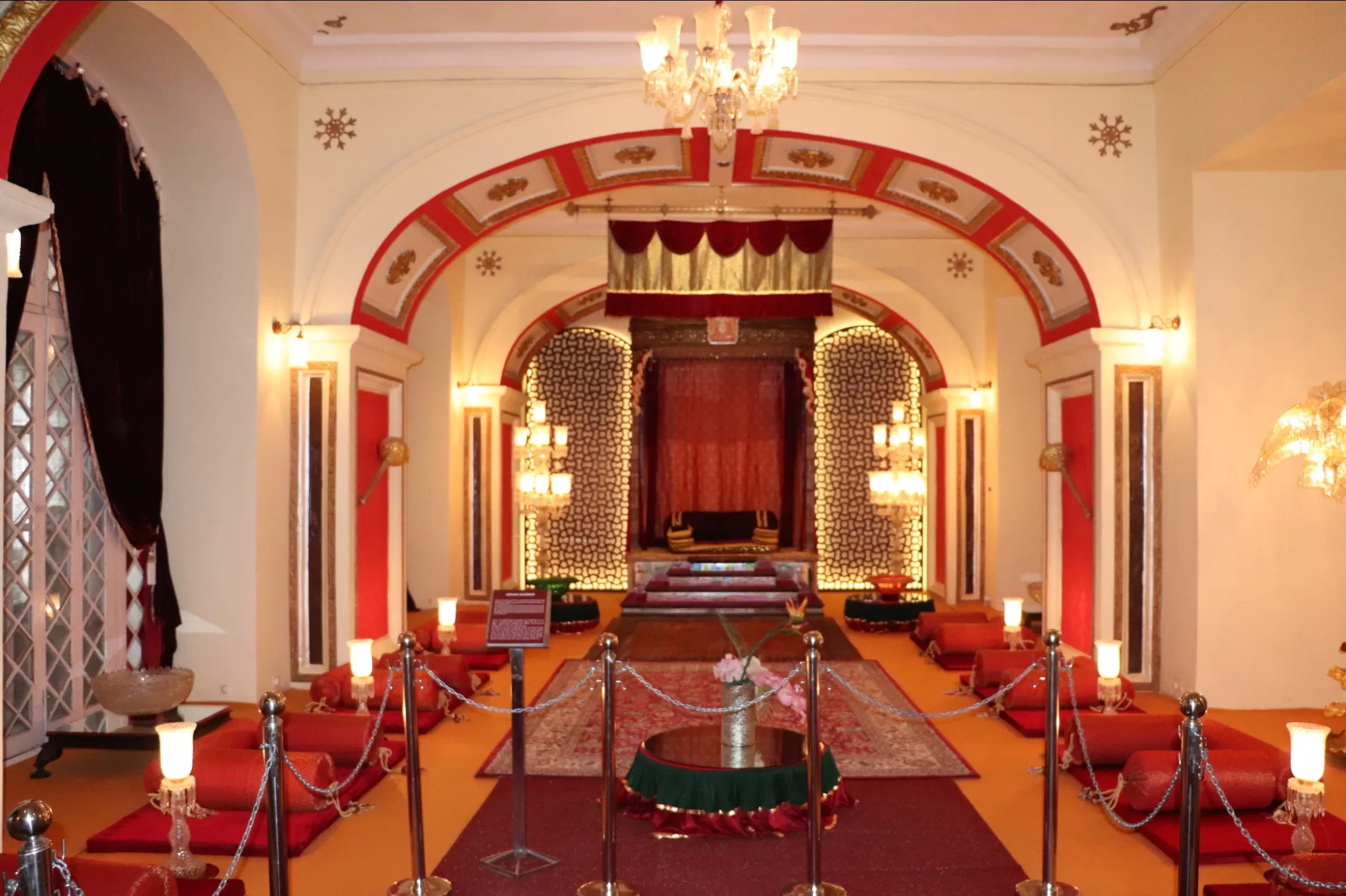 The most impressive part of the palace is the Durbar Hall, which is the main hall where the royal ceremonies and functions were held. The Durbar Hall is adorned with two gigantic chandeliers, which are the largest pair of chandeliers in the world. Each chandelier weighs 3.5 tonnes and has 250 light bulbs. The ceiling of the hall is 50 feet high and is painted with gold leaves. The floor of the hall is covered with a huge carpet, which is the largest single-piece carpet in Asia. The carpet was specially woven by the prisoners of the Gwalior Fort. The hall also has a large silver train, which was used to serve drinks and refreshments to the guests. The train runs on a miniature rail track around a large dining table.