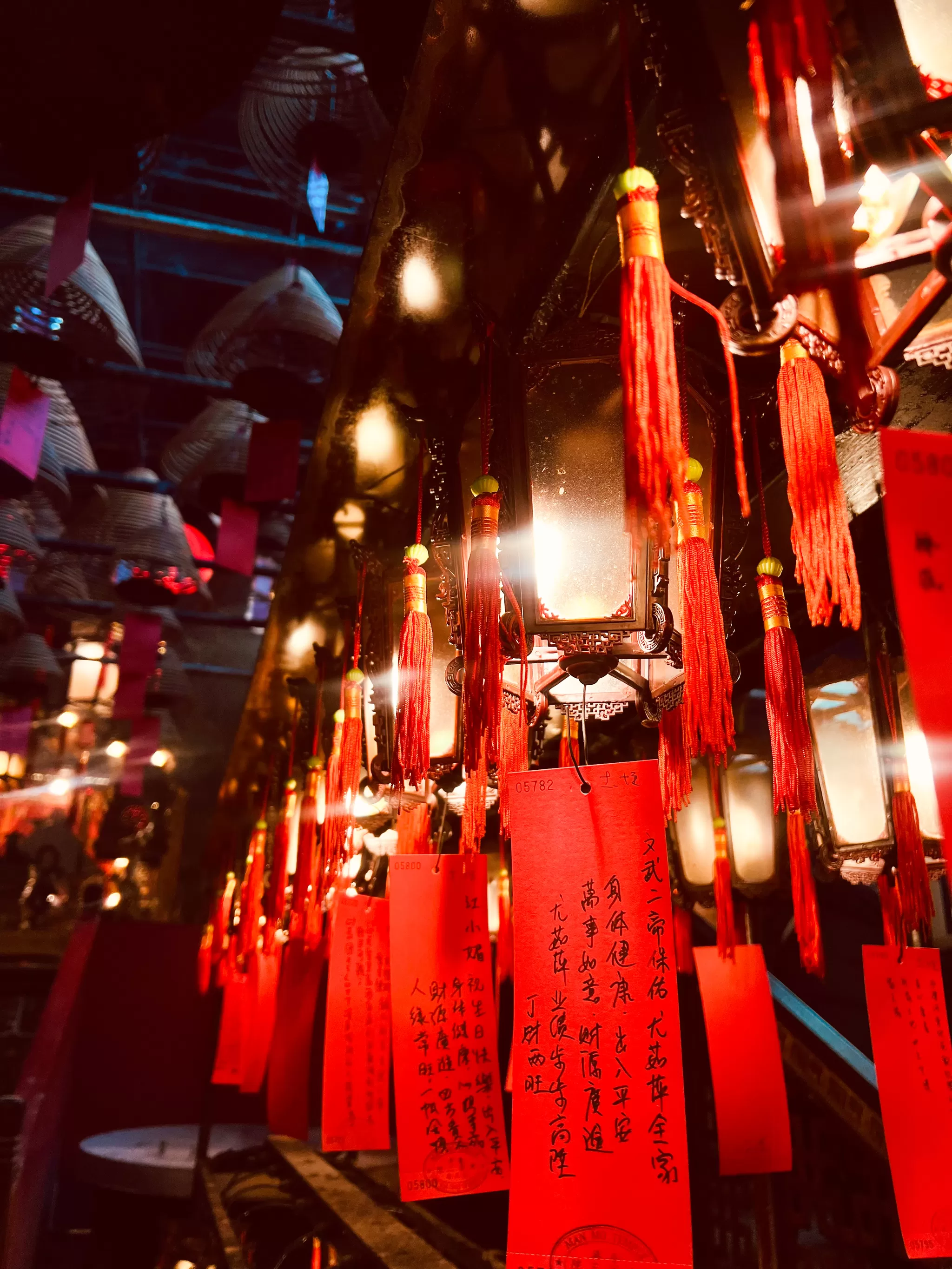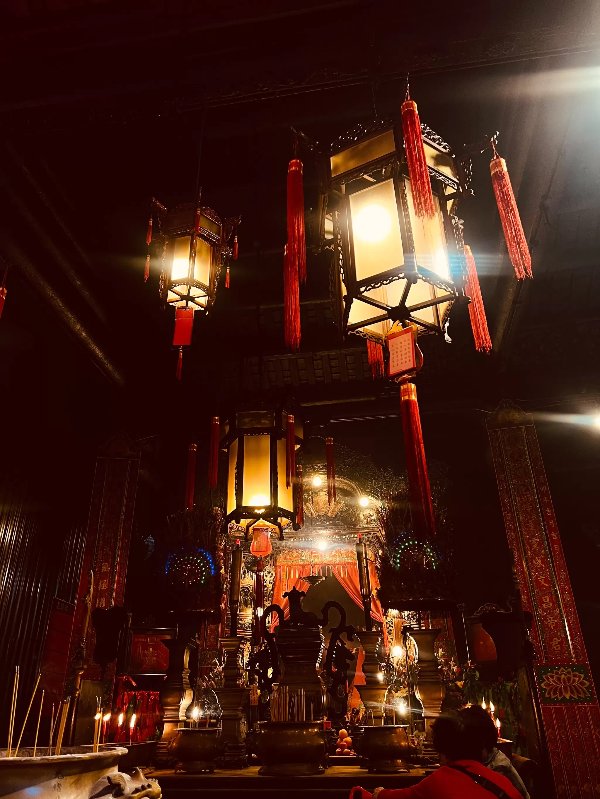 The lanterns are also used for lighting and decoration, and some of them have wishes written on them by the devotees. The side halls are used for various purposes, such as storing antiques, displaying calligraphy, and offering services to the visitors. The courtyard is a small and peaceful space that connects the main hall and the side halls, and also serves as a ventilation and lighting source for the temple.