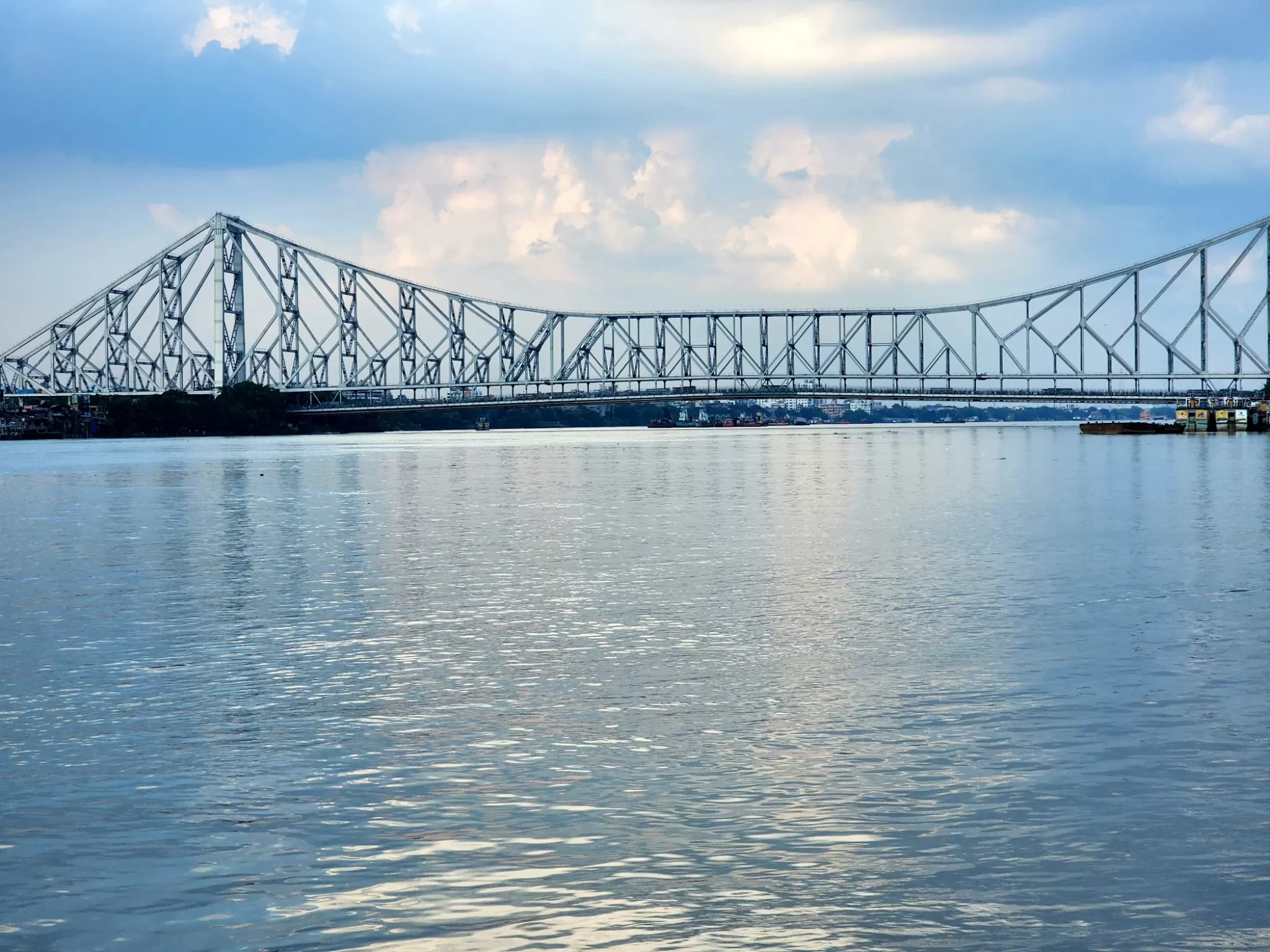 The Howrah Bridge is one of the largest cantilever bridges in the world. A cantilever bridge is a type of bridge that has two arms projecting from each pier and supporting a central span. The bridge has a total length of 705 meters (2,313 feet) and a width of 30 meters (98 feet). The central span is 457 meters (1,500 feet) long and has a clearance of 26 meters (85 feet) above the water level. The bridge can carry a load of up to 60,000 tonnes.