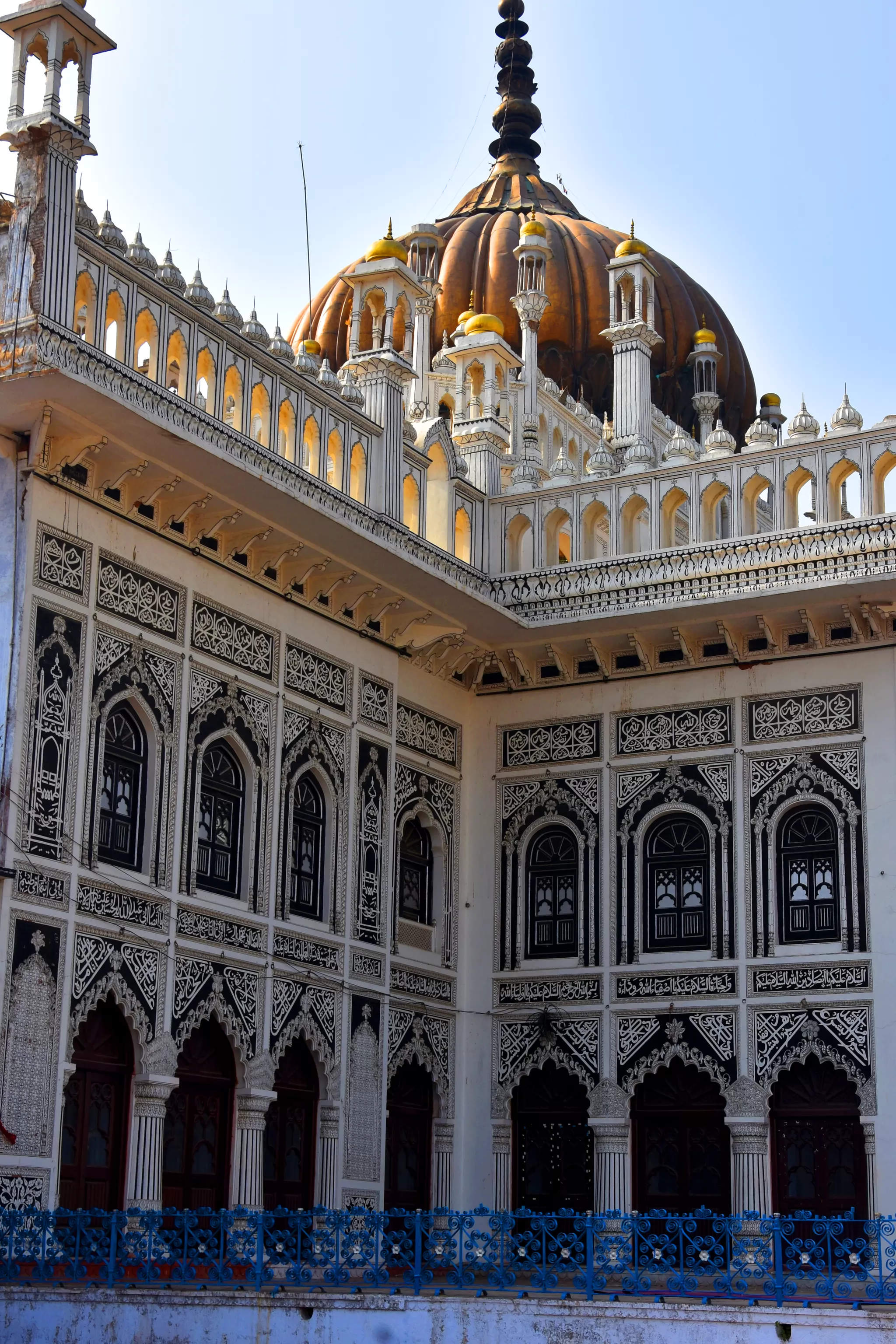The architecture and design of Chota Imambara is influenced by the Persian, Mughal, and Awadhi styles. The Imambara is built of white marble and limestone, and is adorned with elaborate carvings, paintings, calligraphy, and chandeliers. The exterior of the Imambara is decorated with Quranic verses and floral motifs, while the interior is embellished with mirrors, crystals, silver, and gold. The dome of the Imambara is crowned with a golden finial, which is said to be made of pure gold. The Imambara also has two large gateways, called Rauza and Baqeeda, that lead to the main hall. The Rauza is the main entrance, which is flanked by two minarets and has a large arch with a clock. The Baqeeda is the secondary entrance, which is smaller and simpler than the Rauza.