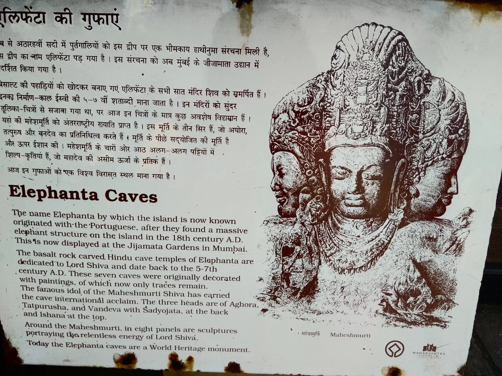 The Trimurti sculpture depicts Shiva as Brahma, Vishnu, and Rudra, showcasing his cosmic role.