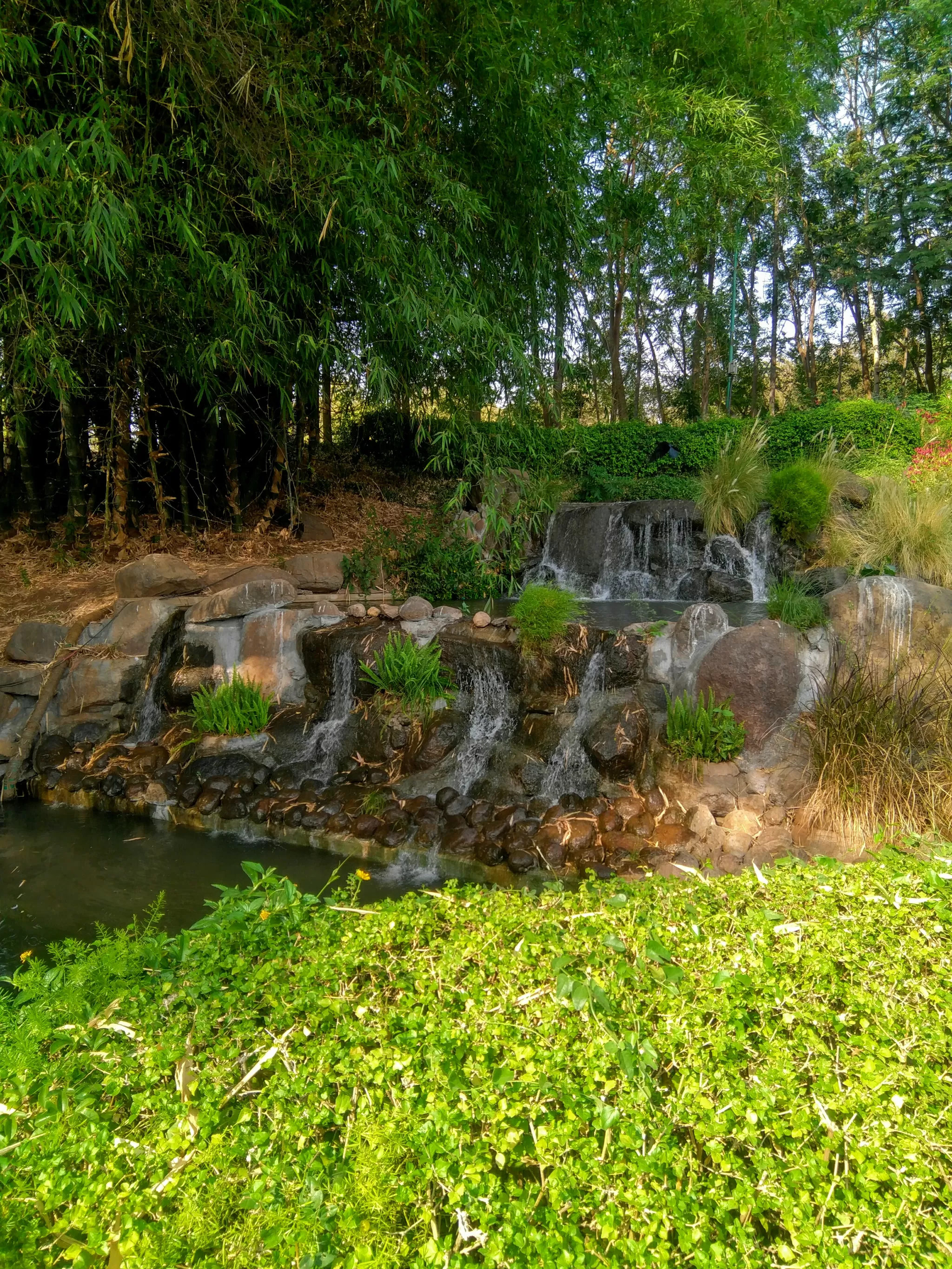 The garden also has several pergolas and lawns that provide shade and space for relaxation and recreation. The pergolas are made of wood and bamboo and have benches and tables for visitors to sit and enjoy the view. The lawns are well-maintained and have colorful flowers and grasses.