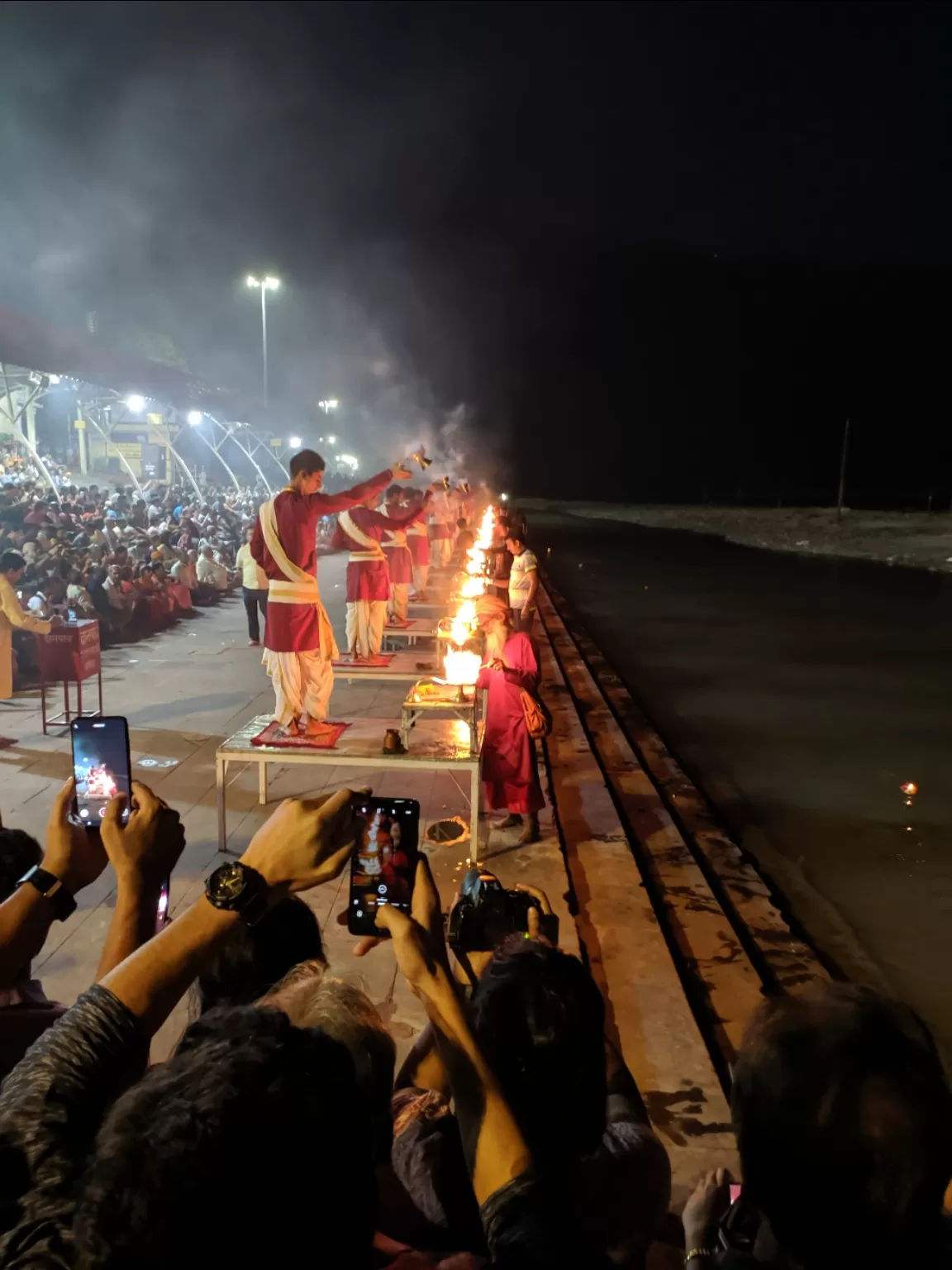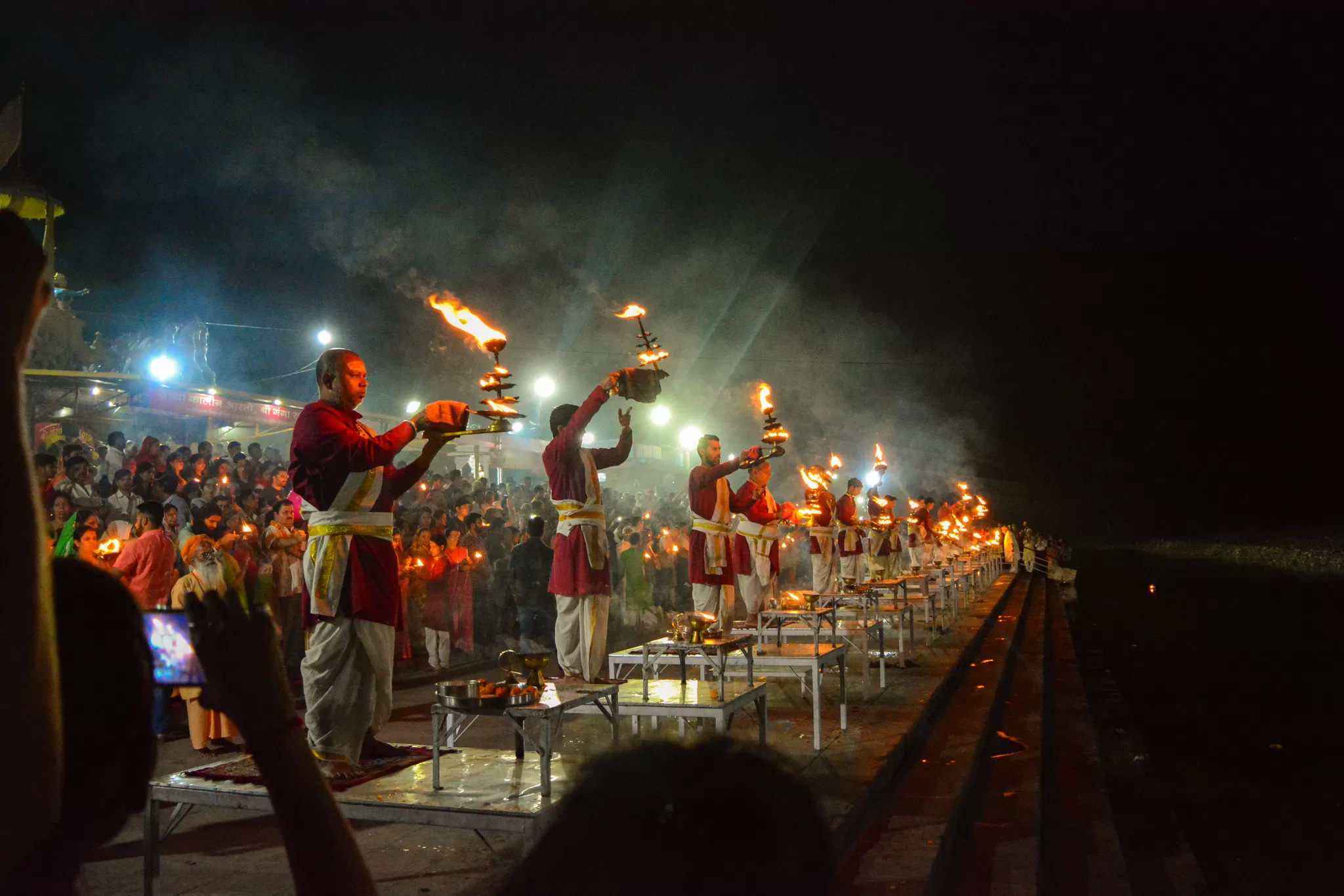 The Ganga Aarti at Triveni Ghat is a spectacular sight to behold. You can see hundreds of lamps floating on the water, creating a magical glow. You can also hear the sound of bells, conches, drums, and hymns filling the air with devotion. You can feel the energy and vibrancy of the crowd as they sing along and clap their hands.