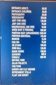 Boating: The charges for boating vary depending on the type of boat and the duration. The approximate charges are Rs. 1000 for 5 persons for speed boating (15 min), Rs. 450 per couple for coracle riding (30 min), Rs. 150 per person for pedal boating (30 min) and Rs. 300 per person for kayaking (30 min). The timings for boating are from 9 am to 5 pm. The tips for boating are to wear life jackets, follow safety instructions, avoid littering and respect other boaters.